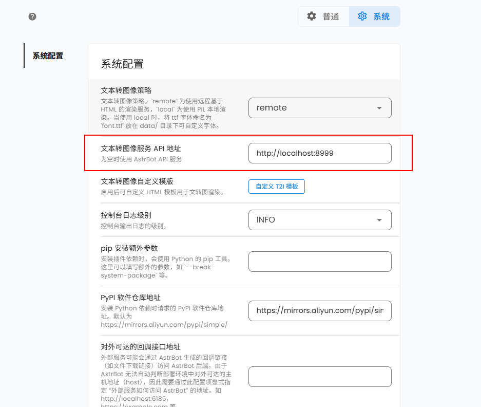 在AstrBot中配置文转图服务的地址时要是使用宿主机的真实IP,不能使用127.0.0.1等指向本机的地址。